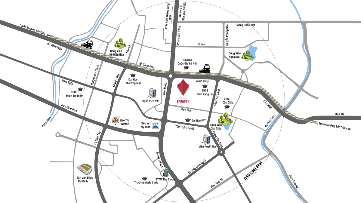 Hà Nội Paragon Tower sở hữu một vị trí ”Vàng” giáp đường Phạm Hùng. Bao quanh dự án là con phố chính như: Duy Tân, ngay phía sau tòa nhà IPH …vv; được kết nối với các trực đường lớn như Lê Văn Lương, Phạm Hùng, Cầu giấy.Ngoài ra dự án còn được hưởng trọn hạ tầng xã hội đã hoàn thiện bao quanh như công viên Cầu Giấy, Công Viên Nghĩa Đô.v.v.Các bệnh viện lớn như bệnh viên 198 Bộ công an, các trung tâm mua sắm như siêu thị Big C, trung tâm thương mại the Garden. Cùng với hệ thống các trường học quốc tế và đại học chính quy lớn tạo cho cư dân sinh sống tại đây một cuộc sống thuận tiện và hoàn hảo nhất.