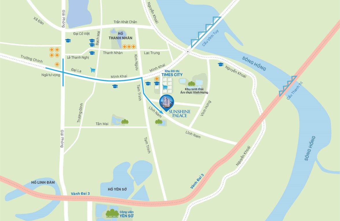 Nằm trong tổng quy hoạch được phối trí theo hình thức hướng tâm của Thủ đô, bao quanh bởi các đường vành đai, Sunshine Palace tọa lạc ở vị trí tiếp cận giữa đường vành đai 2 và vành đai 3 với khoảng cách trên dưới 2km tạo lợi thế lớn cho dự án về mặt kết nối với nhiều địa điểm của thành phố, từ trung tâm tới ngoại ô và các địa hạt phụ cận. Trong đó, trục Tam Trinh - Lĩnh Nam là tuyến giao thông huyết mạch của quận Hoàng Mai với ưu điểm vượt trội của hạ tầng tân tiến, cho phép di chuyển tới trung tâm thành phố chỉ sau ít phút.