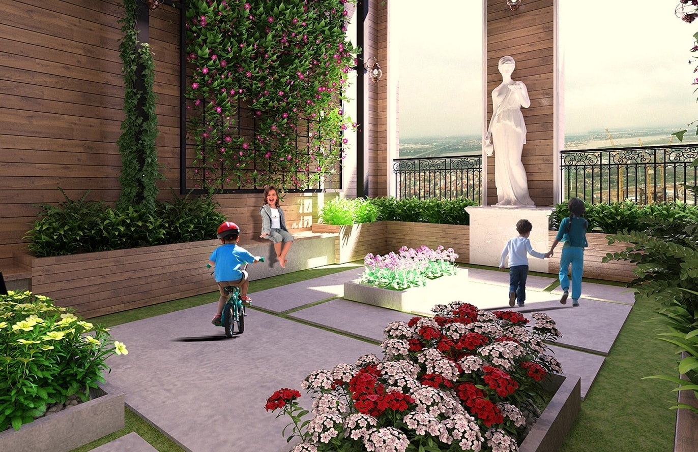 Khơi dậy ý tưởng về một khu vườn Âu ngay trong lòng phố thị, điểm độc đáo của Sunshine Garden là khu vực lõi trung tâm của quần thể ba tòa tháp, một cấu trúc cảnh quan gắn liền những hình ảnh thường thấy trong những tòa lâu đài Châu Âu thanh lịch với tượng đài nghệ thuật được bố trí hòa giữa các mảng cây xanh và hồ nước, kết hợp với các tuyến đường dạo bộ liên hoàn.