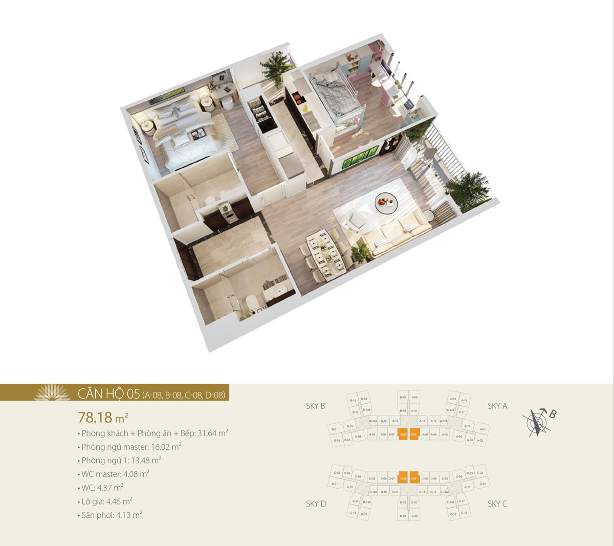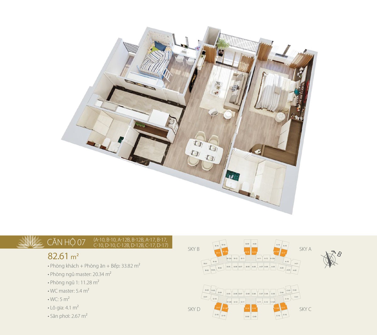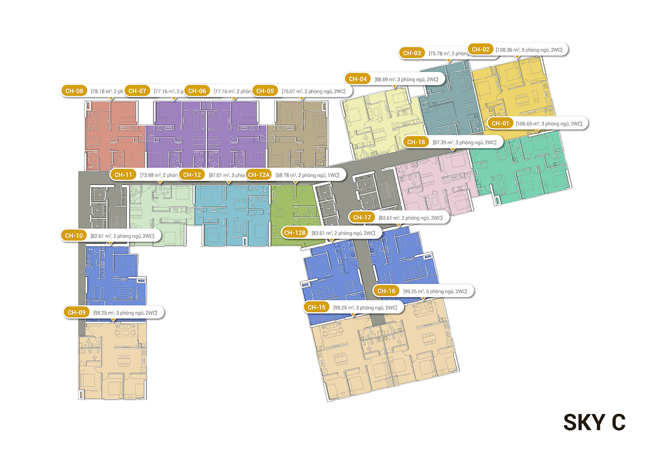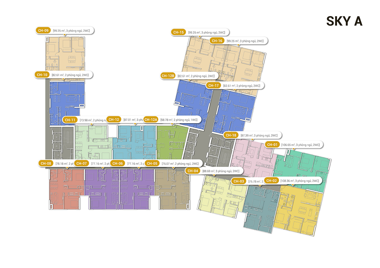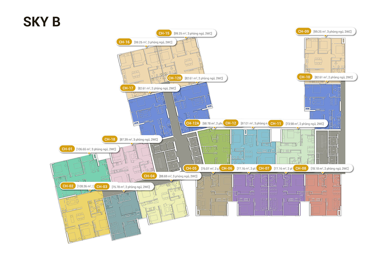 Mỗi tầng gồm 18 căn hộ (10 căn 2 phòng ngủ và 8 căn 3 phòng ngủ), có diện tích từ 57.91 – 105.21m2. Số lượng căn góc có 2 mặt thoáng nhiều, tầm nhìn bao quát sông Hồng và trung tâm thành phố.
