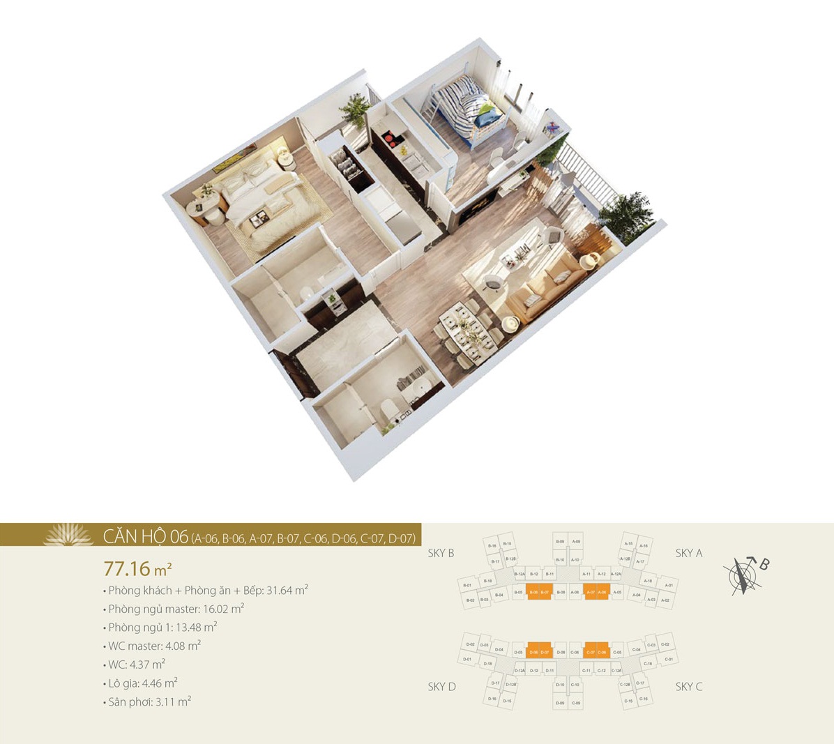 Diện tích thông thủy căn hộ: Từ 57,91m2 đến 105,21m2