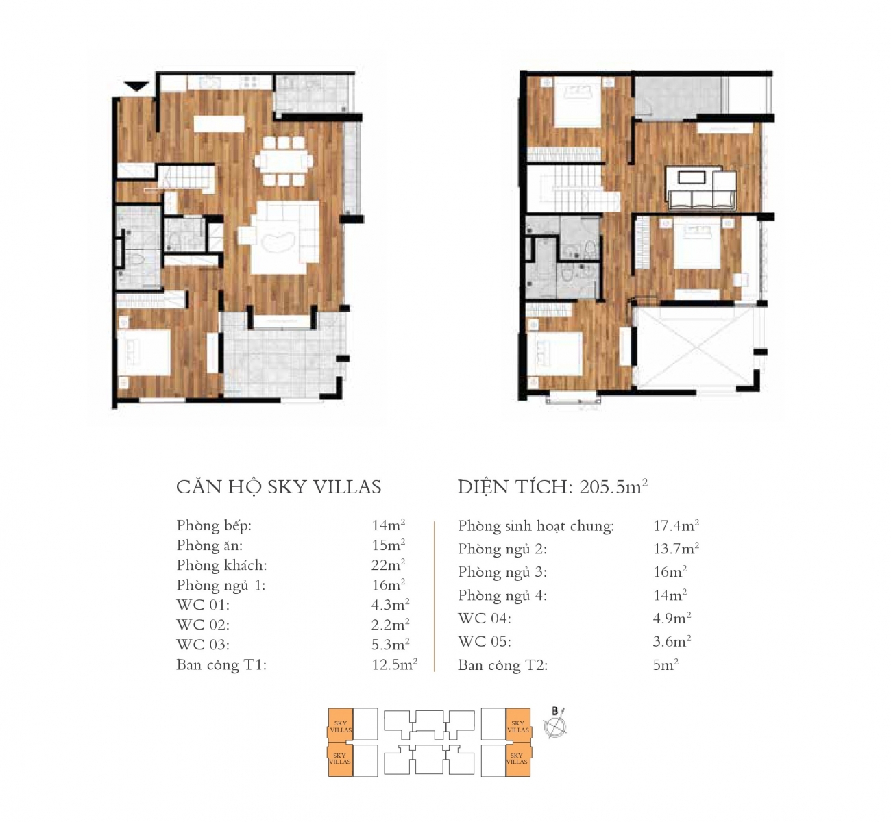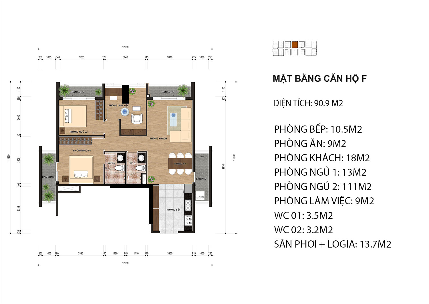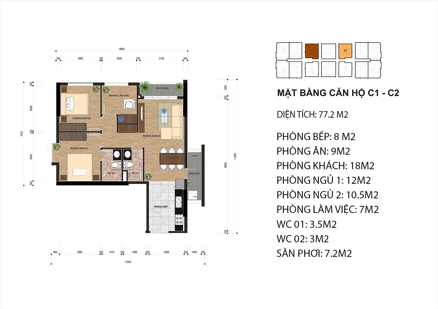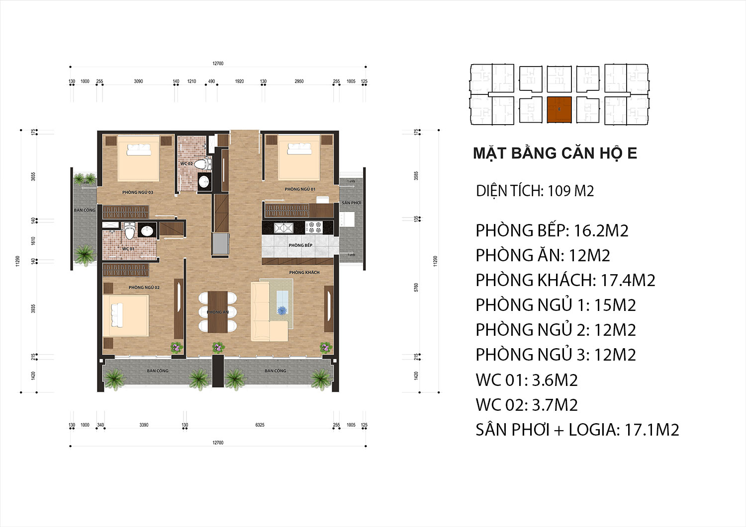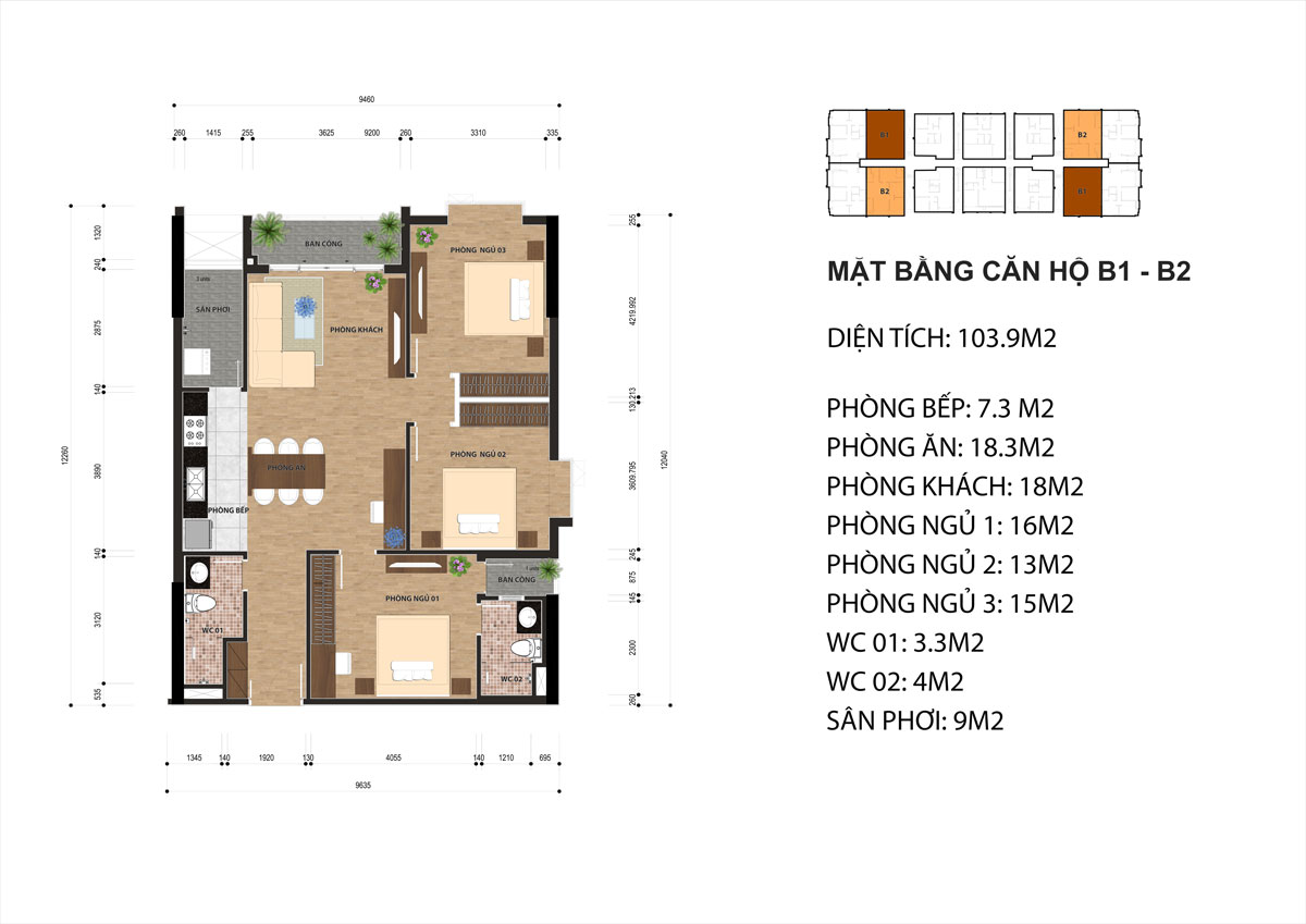 Cơ cấu căn hộ: 2 – 3 PN, diện tích: 77 – 114m2