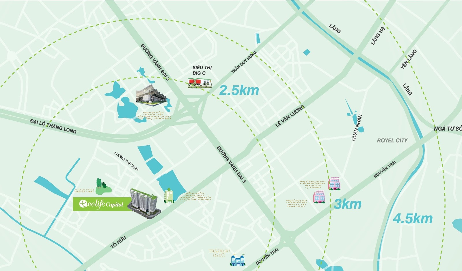Hơn thế nữa, dự án còn là nơi giao thoa của các tuyến đường giao thông huyết mạch như đường Lê Văn Lương, Nguyễn Trãi, Khuất Duy Tiến, Trần Duy Hưng,…, đảm bảo sự thuận tiện cho cư dân khi di chuyển đến các trung tâm vui chơi, giải trí, mua sắm của Thủ đô. Từ đây, cư dân chỉ mất khoảng 5 phút là đến siêu thị Big C Thăng Long hay trung tâm Hội nghị Quốc gia,..hay mất 10 phút là đến Hồ Hoàn Kiếm, Thiên đường Bảo Sơn – là những danh lam thắng cảnh nổi tiếng của Thủ đô…