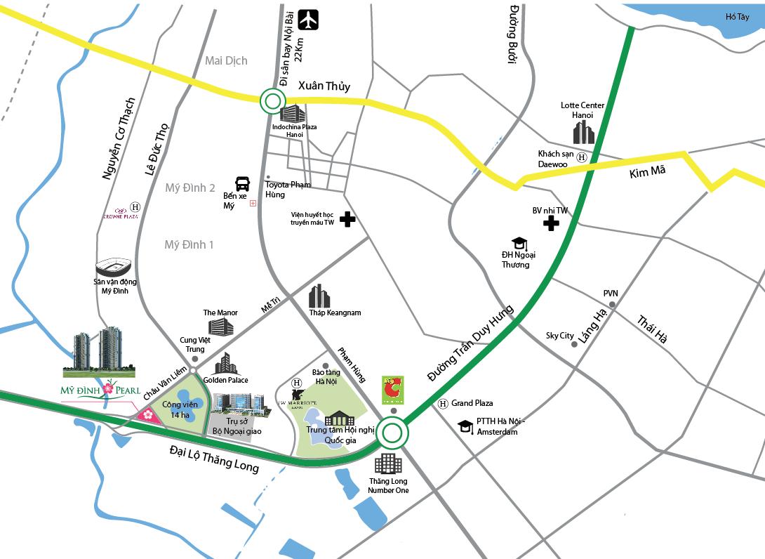 Dự án Chung cư Mỹ Đình Pearl nằm rất gần các trung tâm hành chính lớn của thành phố Hà Nội như: Bộ Ngoại Giao mới, Trung tâm hội nghị quốc gia, bảo tàng hà nội, Sân vận động Mỹ Đình,… Mỹ Đình Pearl nằm khá gần các trung tâm thương mại lớn như: BigC Thăng Long, Keang Nam, The Garden, Metro Thăng Long ... Bao quanh Mỹ Đình Pearl là Công viên hồ điều hòa rộng 25 ha, vườn hoa, thảm cỏ. Mọi căn hộ tại Mỹ Đình Pearl đều hướng ra công viên, đây chính là đặc điểm nổi bật của khu tổ hợp dự án này. Phong cảnh tuyệt vời vào buổi sáng mỗi khi thức giấc làm tăng năng lượng cho một ngày làm việc. Hay mỗi khi chiều về ngắm hoàng hôn tại Công viên ngay dưới chân nhà mình đem đến cảm xúc thăng hoa mà ít dự án có được tại Hà Nội.