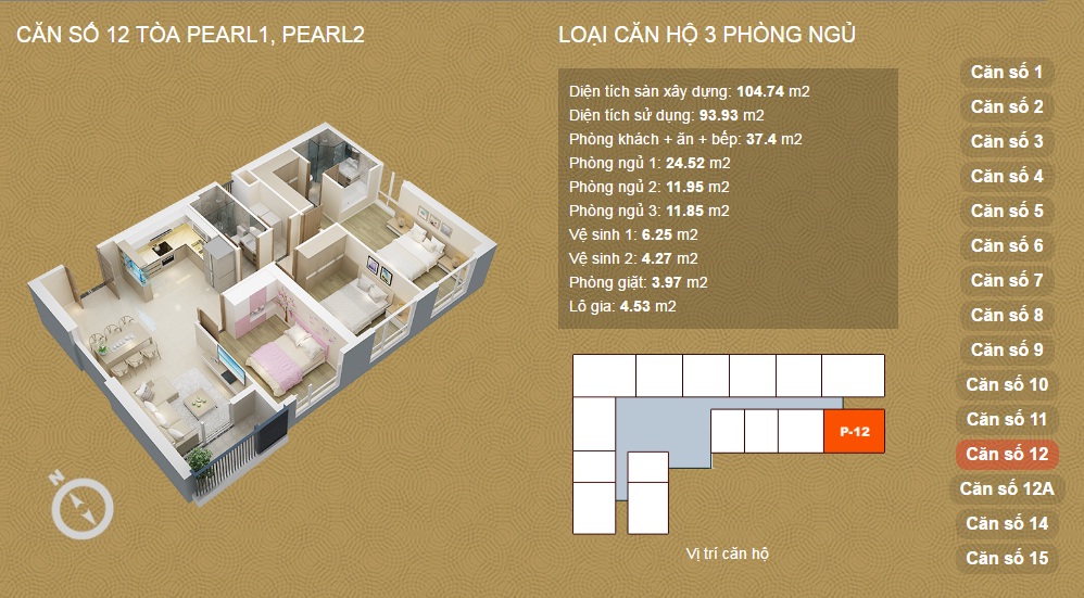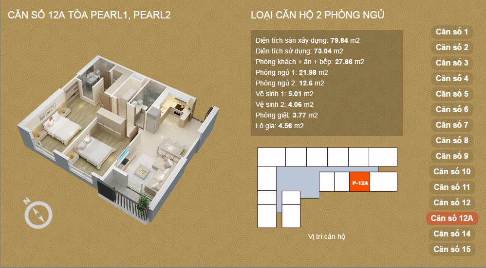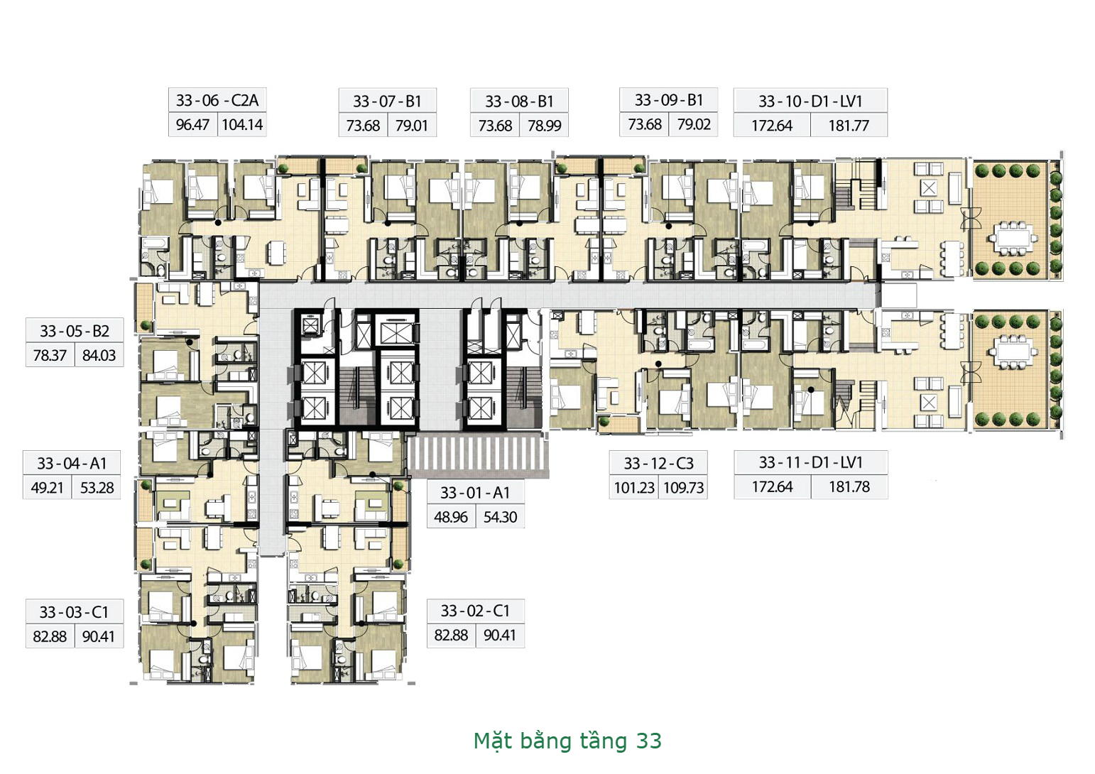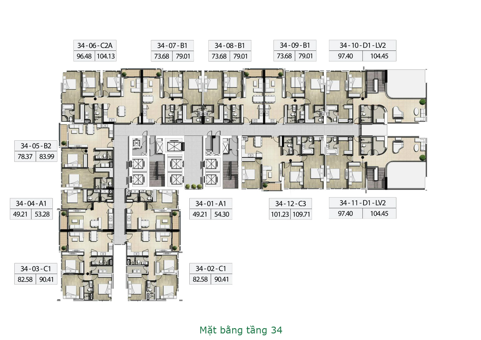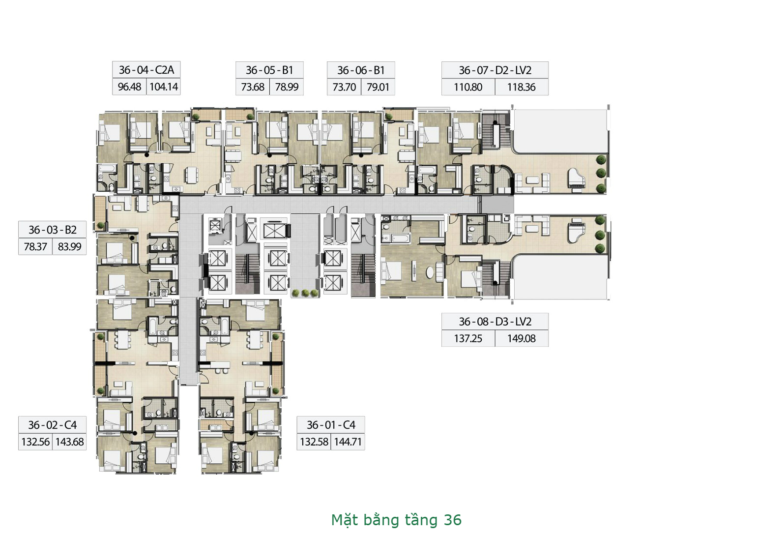 Các căn hộ rất vuông vức, diện tích linh hoạt từ 53 - 104 m2 bao gồm các loại căn hộ từ 1 - 3 phòng ngủ (tầng 3 -32). Mỗi tòa đều được bố trí tới 7 thang máy, mật độ tháng máy / căn hộ thấp giúp cho việc di chuyển rất nhanh chóng.