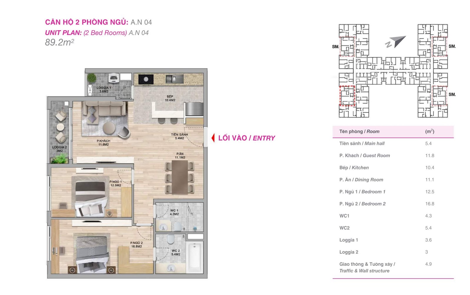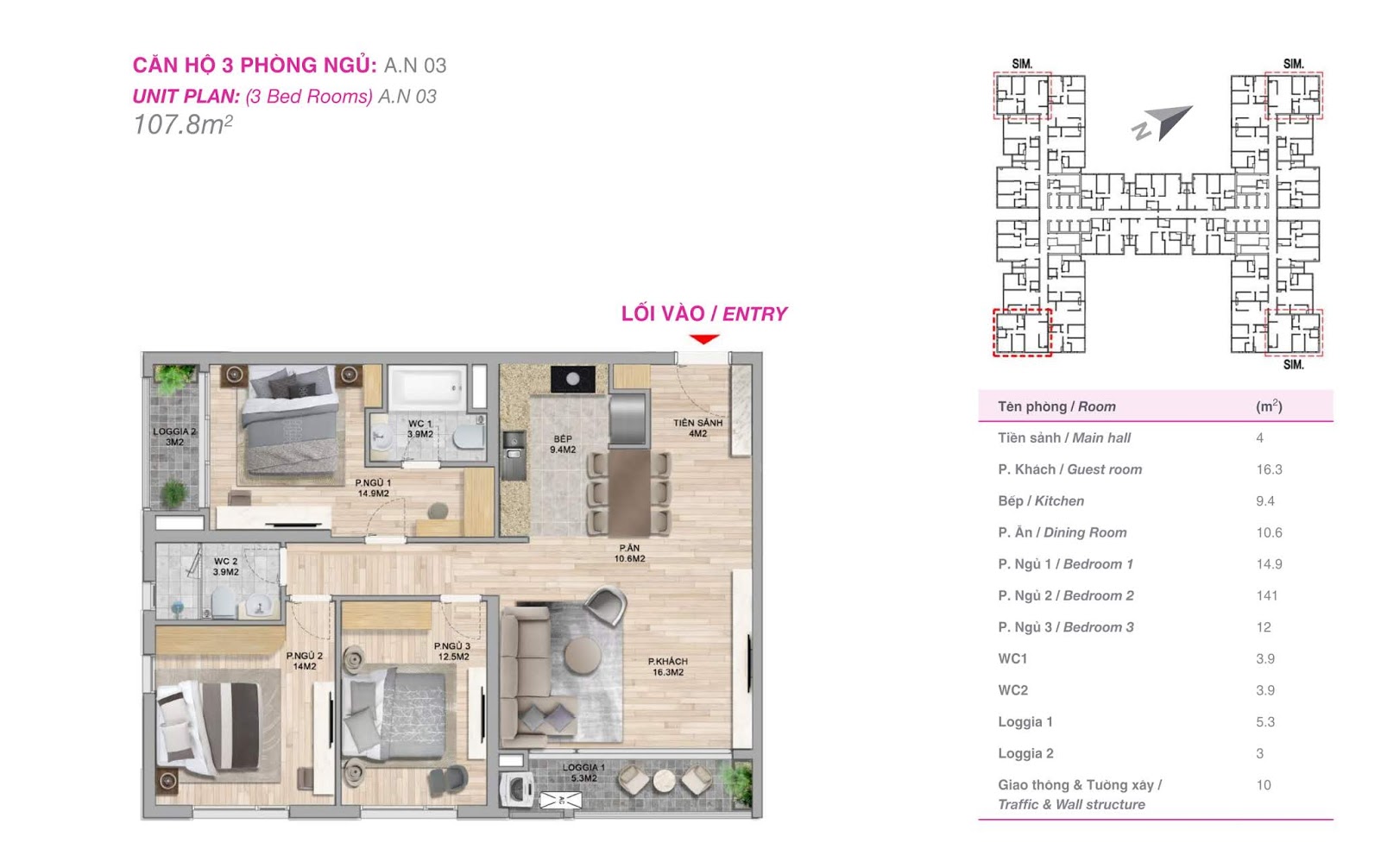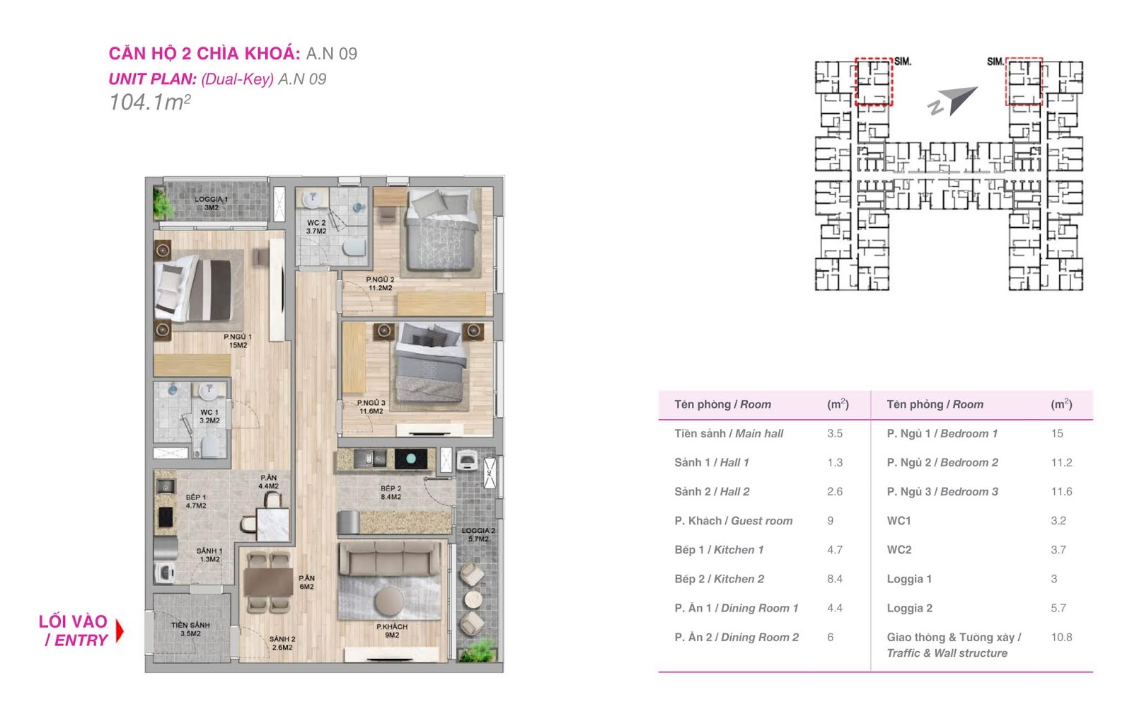 - 331 căn hộ 3 phòng ngủ: 104 – 108 m2 (thông thủy)