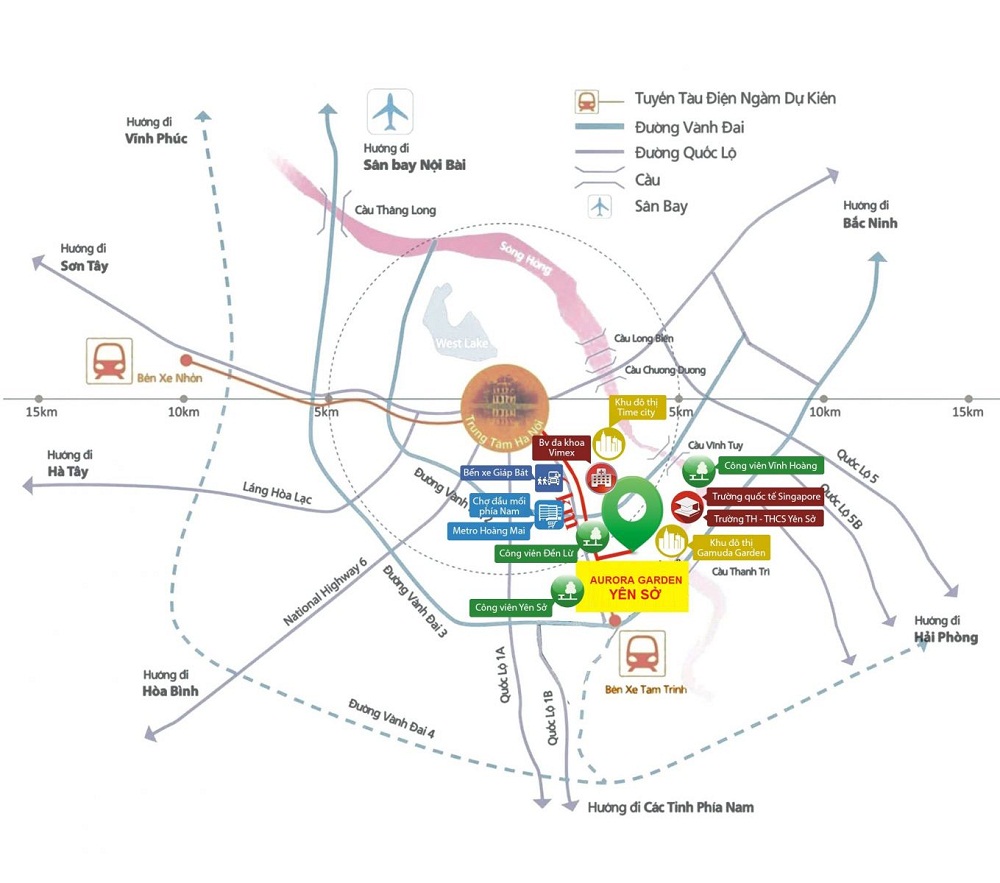 Bạn có thể dễ dàng đi đến Aurora Garden thông qua đường Tam Trinh, Quốc lộ 1A, 1B, đường Vành đai số 3, cầu Thanh Trì và đường Vành đai số 4 trong tương lai.