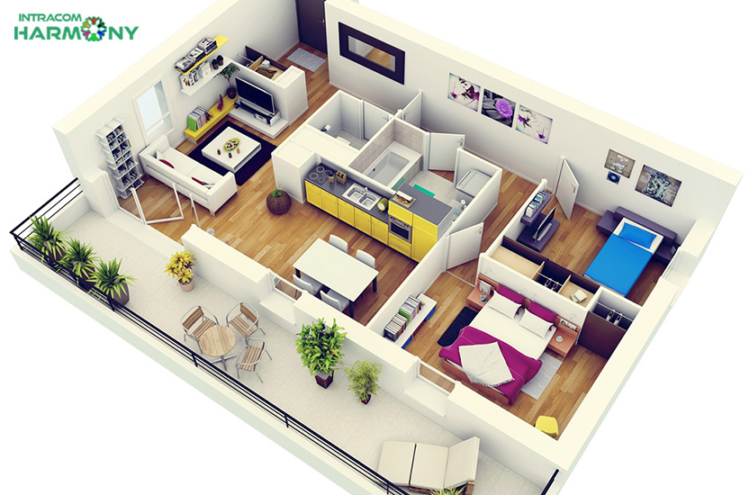 Cách bố trí căn hộ rất chú trọng vào trang trí họa tiết và nội thất tiện nghi hiện đại. Không gian các phòng được bố trí một cách hợp lý. Bạn sẽ có một không gian sống ấm cúng, quây quần bên gia đình. Thiết kế nội thất thông minh cũng sẽ tạo không gian thoáng đãng, thoải mái cho gia đình bạn và giúp tận dụng không gian căn hộ. Người dân sẽ không còn phải lo sẽ sống trong căn hộ chung cư chật hẹp, ngột ngạt. Với phong cách đơn giản, tinh tế, Intracom Harmony sẽ làm hài lòng ngay cả những khách hàng khó tính nhất.