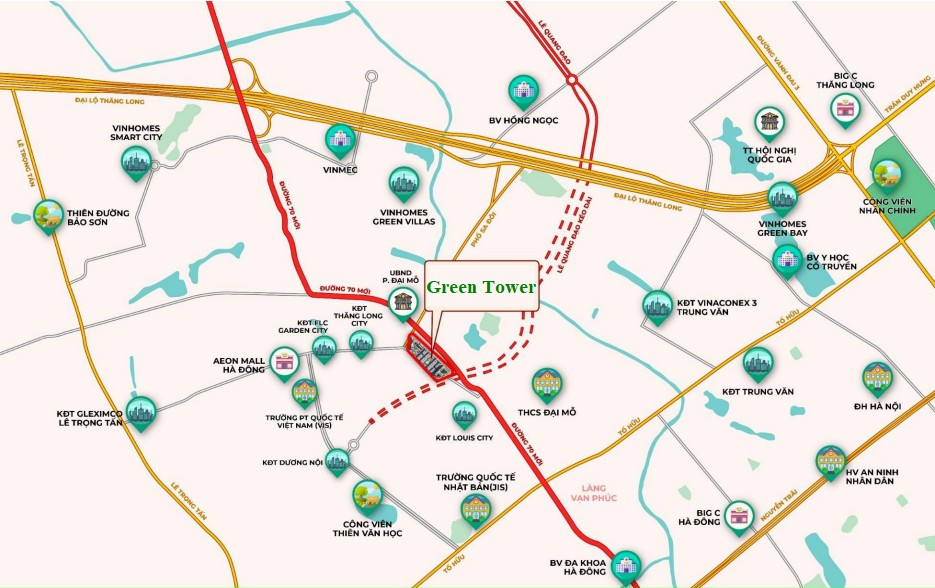 Dự án Nhà ở xã hội Green Tower nằm gần trục đường Lê Quang Đạo kéo dài và trục đường 70, giao thông vô cùng thuận lợi.