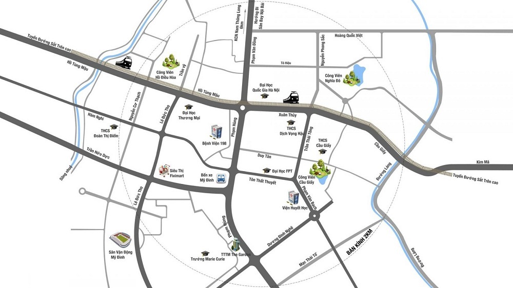 - Trung tâm thể thao Mỹ Đình: Khu liên hợp thể thao quốc gia cùng hạ tầng hiện đại đi kèm, kết nối qua đường Mễ Trì, Lê Đức Thọ (3km)