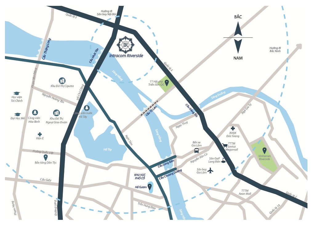 Các căn hộ tại dự án Intracom Riverside Vĩnh Ngọc sẽ được thừa hưởng toàn bộ hạ tầng, tiện ích tòa nhà cũng như của cả dự án. Từ vị trí này, cư dân chỉ mất vài phút đi sang Huyện Đông Anh hay vào trung tâm thành phố Hà Nội. Dự án cách Hồ Hoàn Kiếm 10km và Hồ Tây 3km, liên kết giao thông cực kỳ thuận lợi với các trục đường lớn và huyết mạch của thủ đô như đường Phạm Văn Đồng, Cầu Thăng Long, Cầu Nhật Tân, đường vành đai 2, đường Lạc Long Quân..