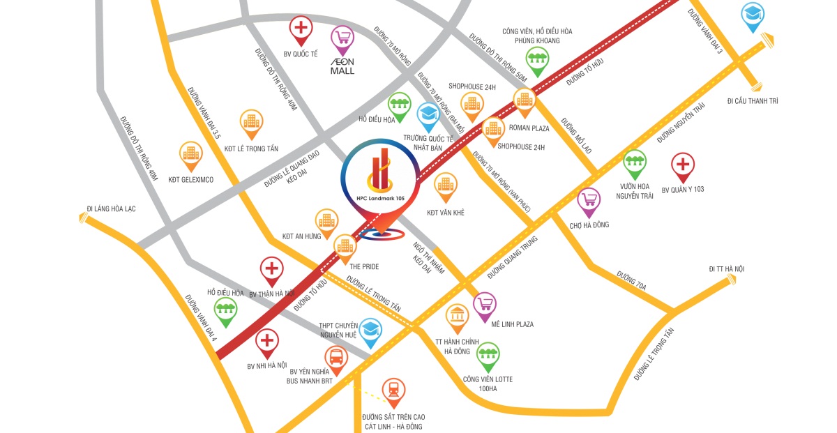 Nằm trong số đó có HPC Landmark 105 – dự án nằm đối diện điểm dừng của tuyến xe buýt BRT Yên Nghĩa – Kim Mã. Không những thế, dự án còn được hưởng lợi bởi tuyến đường sắt đô thị Cát Linh – Hà Đông sắp đi vào hoạt động. Với vị trí chiến lược tại cửa ngõ phía Tây, từ HPC Landmark 105 Hà Đông cư dân lưu thông tới các quận trung tâm một cách dễ dàng bằng các phương tiện công cộng. Cùng với đó, việc nằm ngay tại mặt đường Tố Hữu với 06 làn đường sẽ là lợi thế cạnh tranh rất lớn của dự án với các dự án khác cùng khu vực.