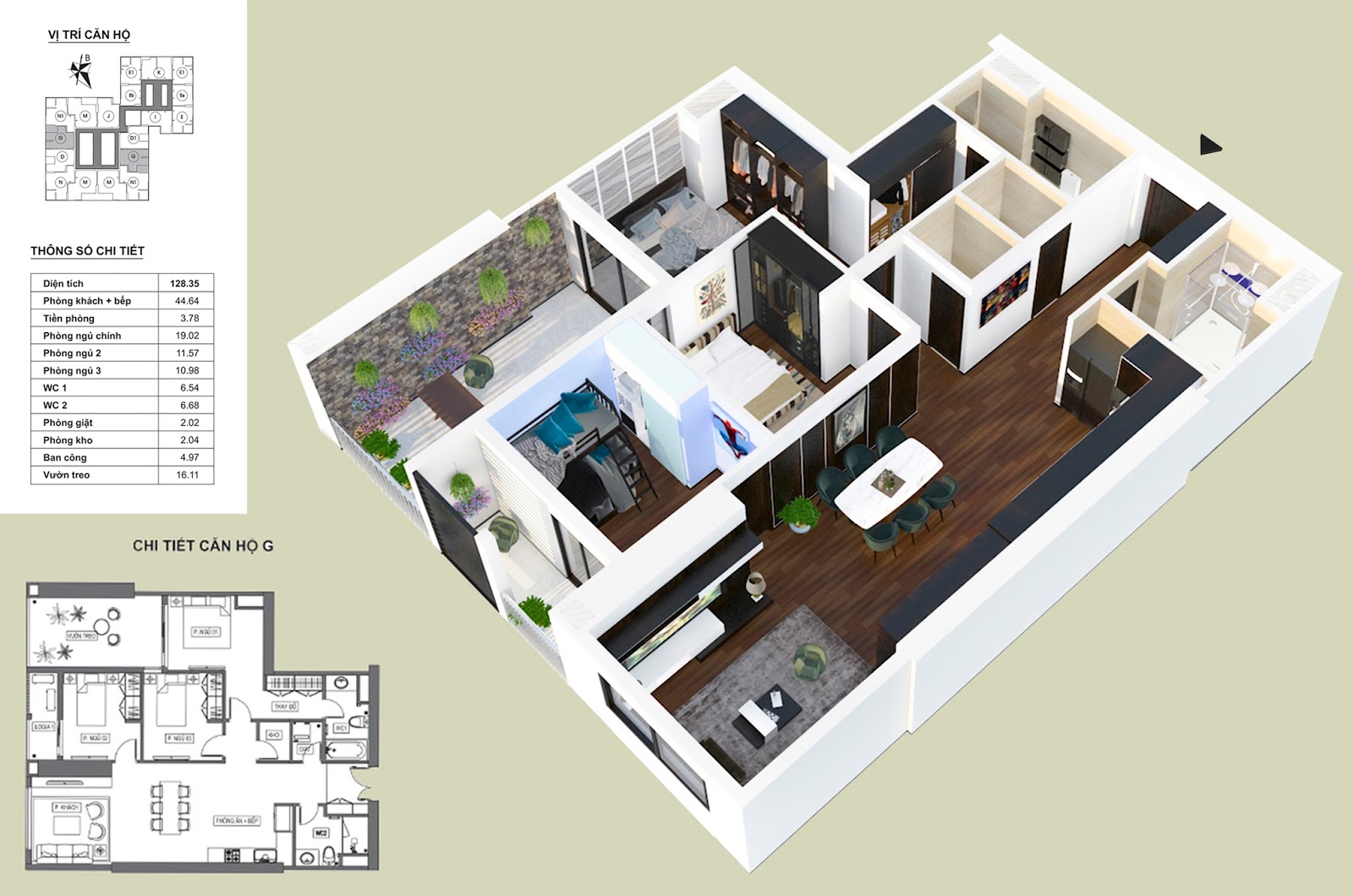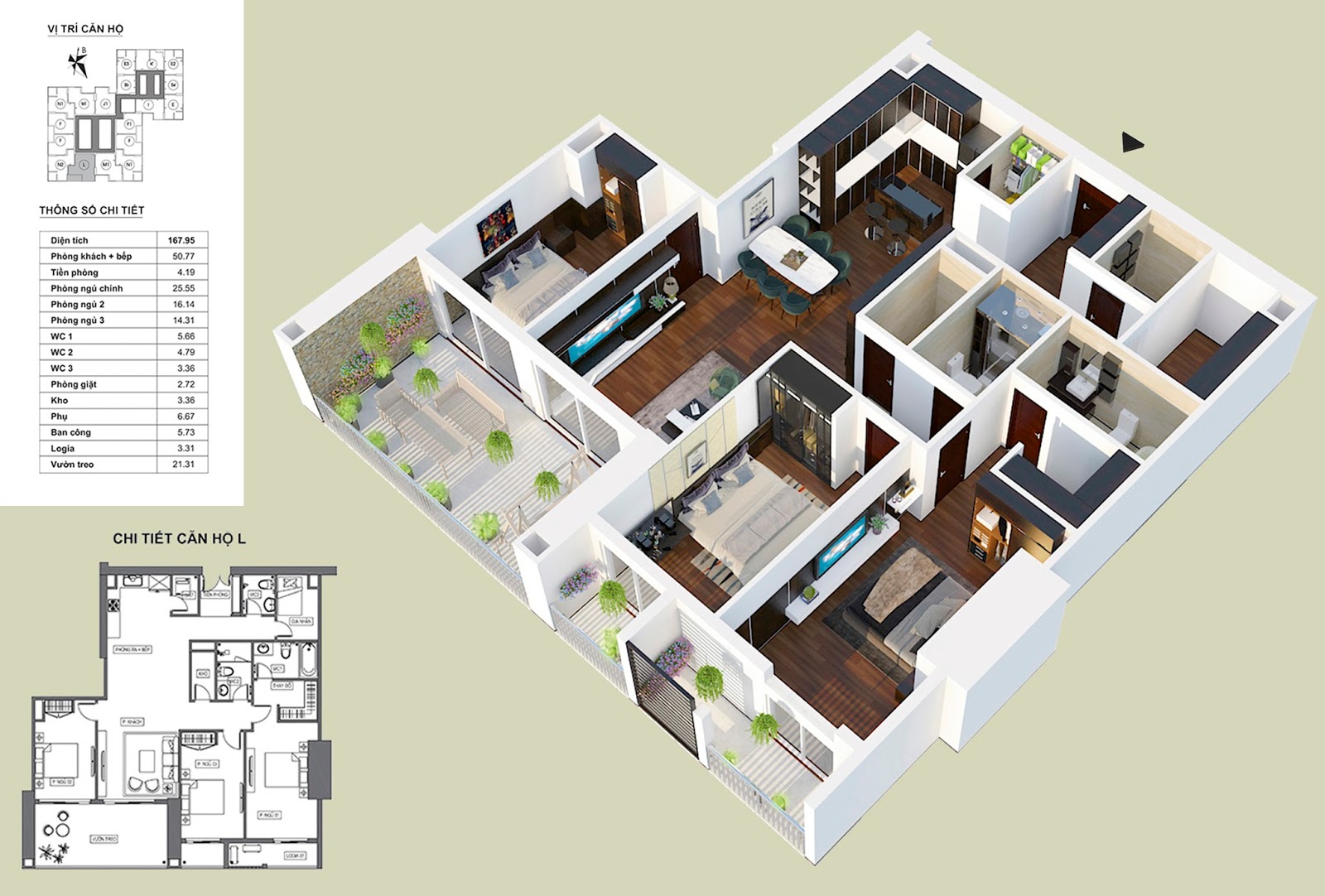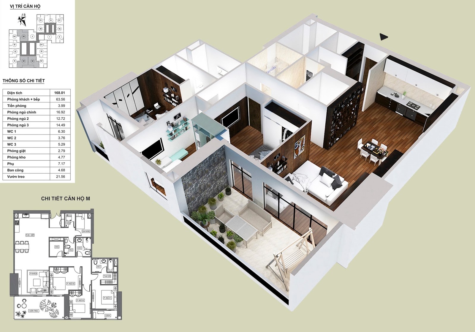 Với diện tích đa dạng từ 82,15m2 - 168,01m2 cùng thiết kế 2PN, 3PN, tối đa hóa công năng sử dụng với nhiều không gian độc đáo như : vườn treo, phòng gia nhân, phòng giặt, kho… dự án mang tới nhiều sự lựa chọn, đáp ứng nhu cầu khác nhau của khách hàng. Đặc biệt, các căn hộ có sân vườn là điểm nhấn thu hút sự quan tâm của nhiều đối tượng, nhất là đối với khách hàng muốn sở hữu căn hộ cao cấp có sân vườn riêng biệt.