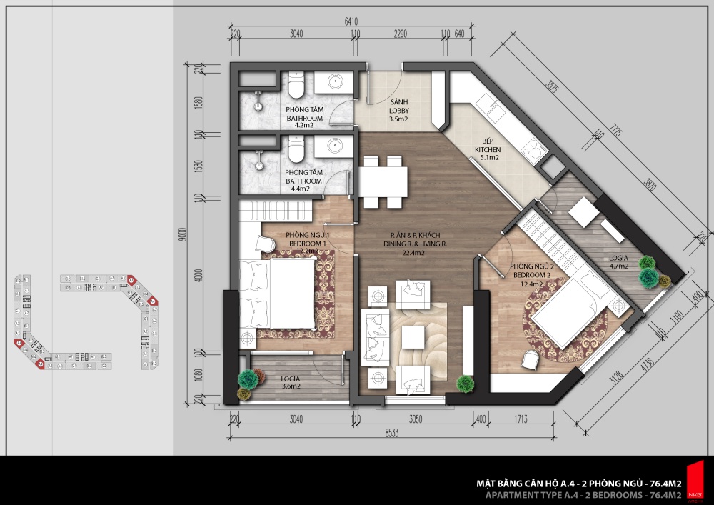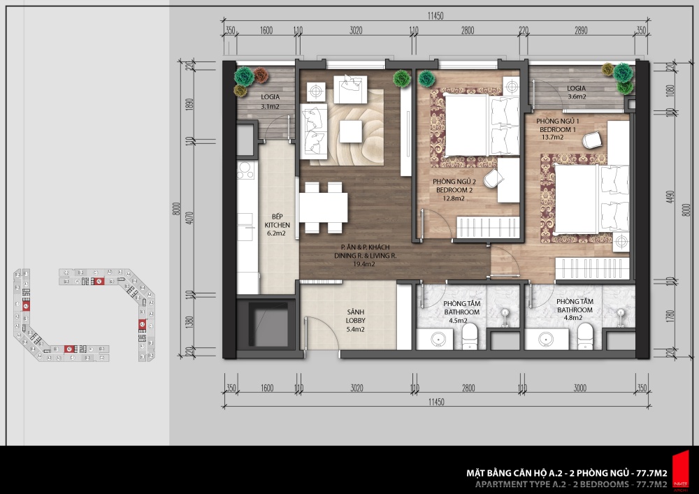 - Căn hộ 2 phòng ngủ: 77 – 79 – 81 – 82m2