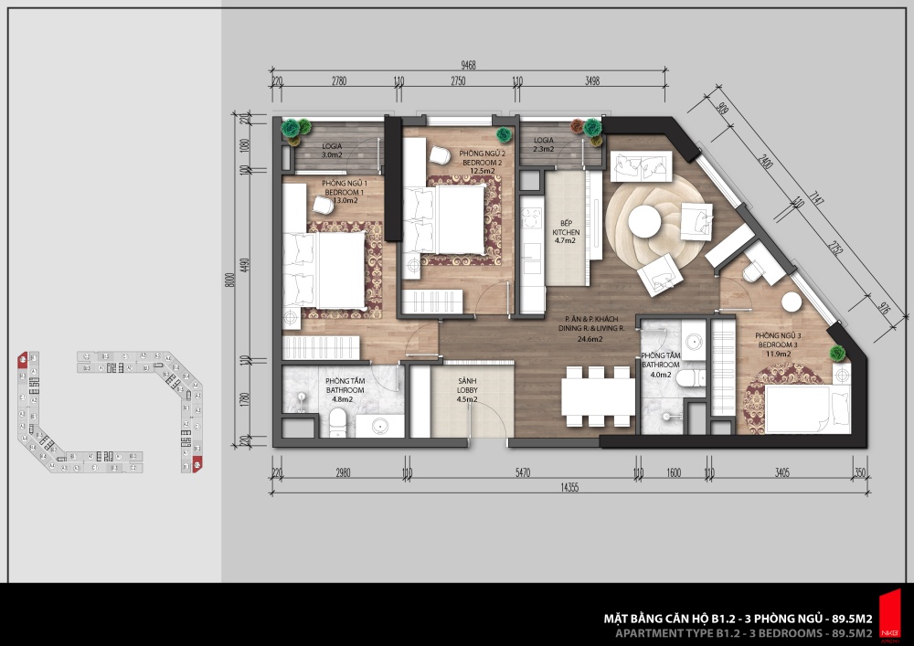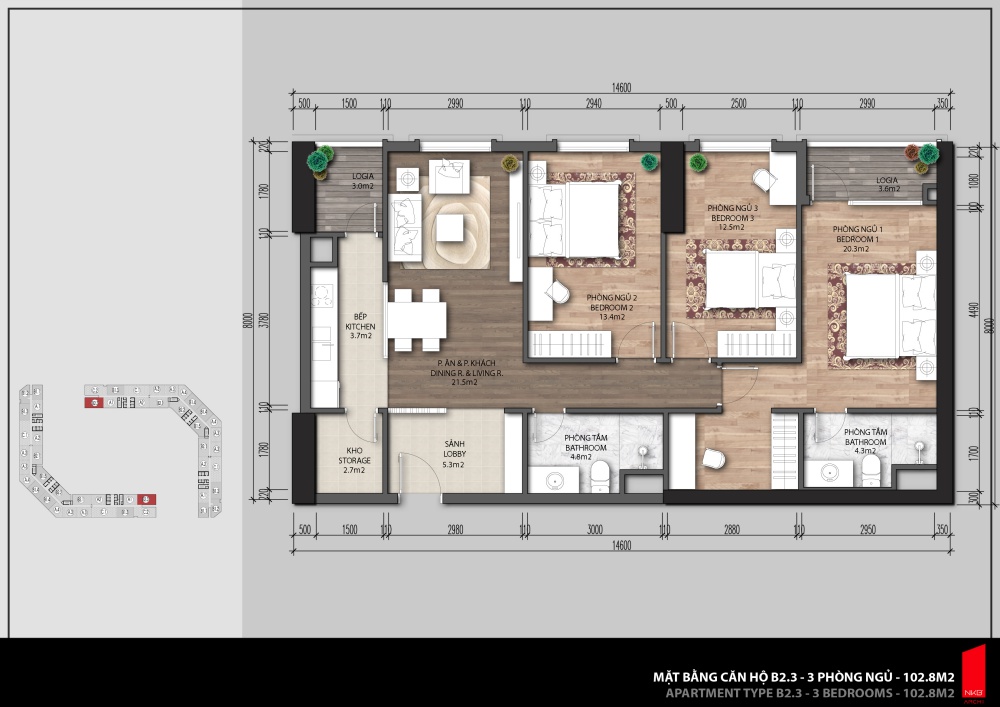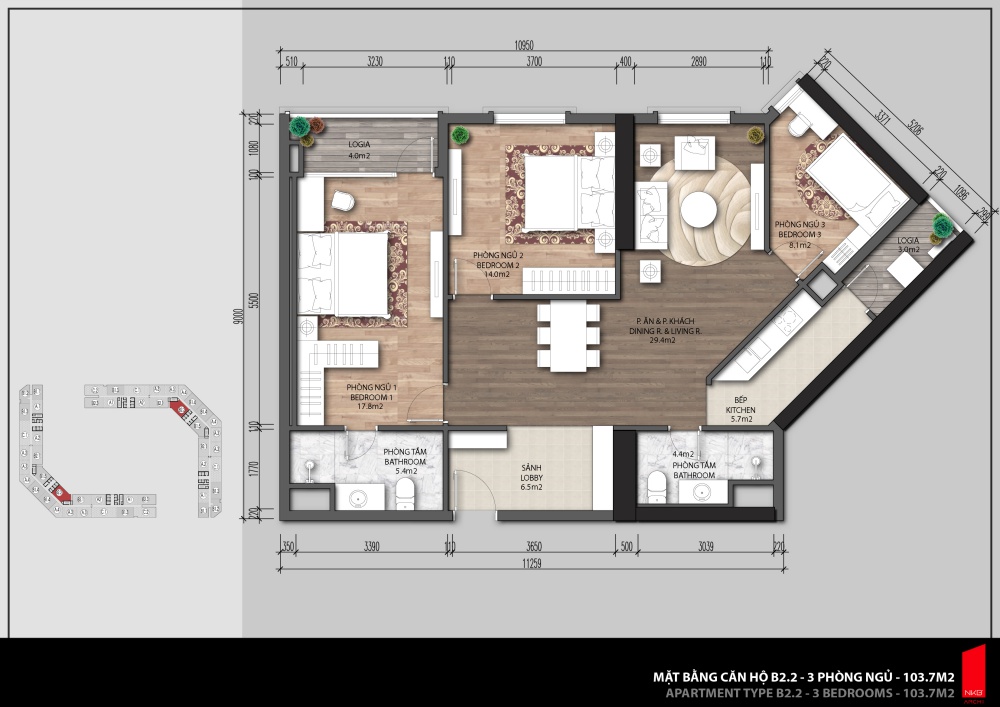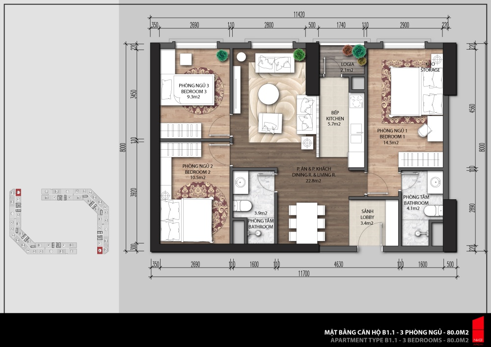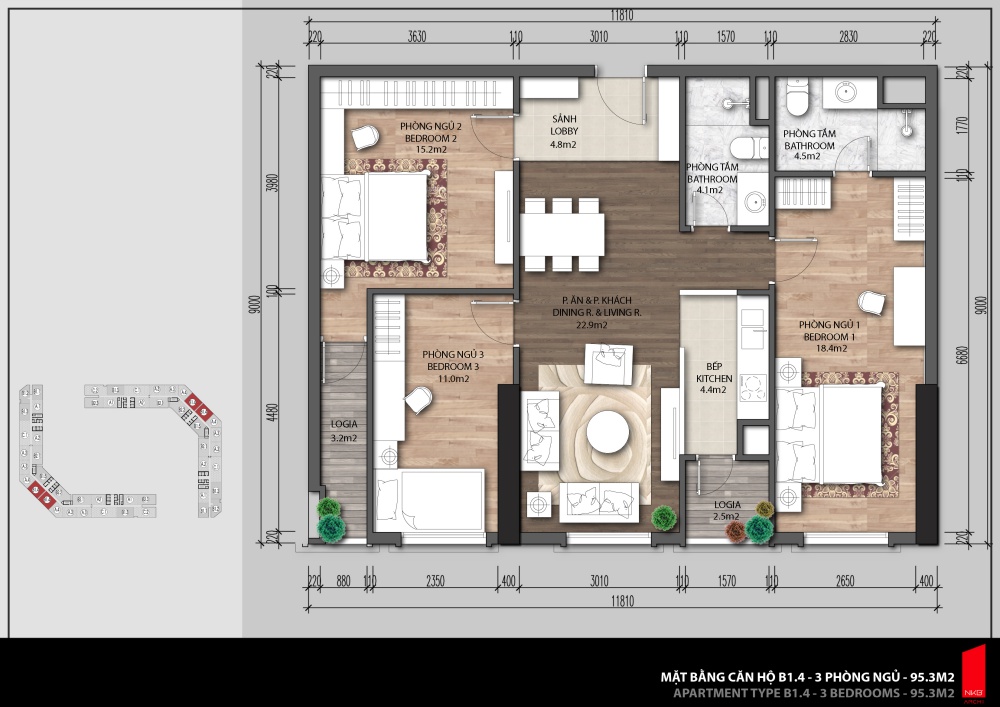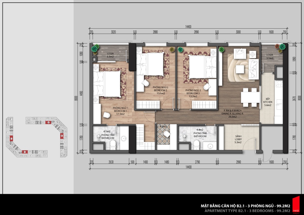 - Căn hộ 3 phòng ngủ: 81 – 91 – 97 – 100 – 105m2