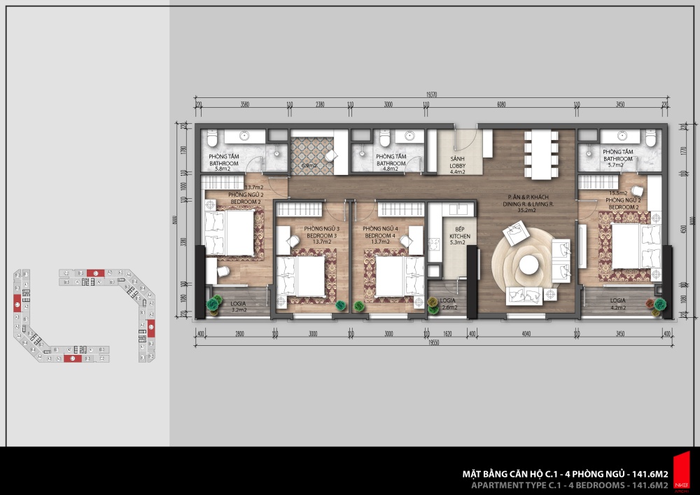 - Căn hộ 4 phòng ngủ: 125 – 142m2