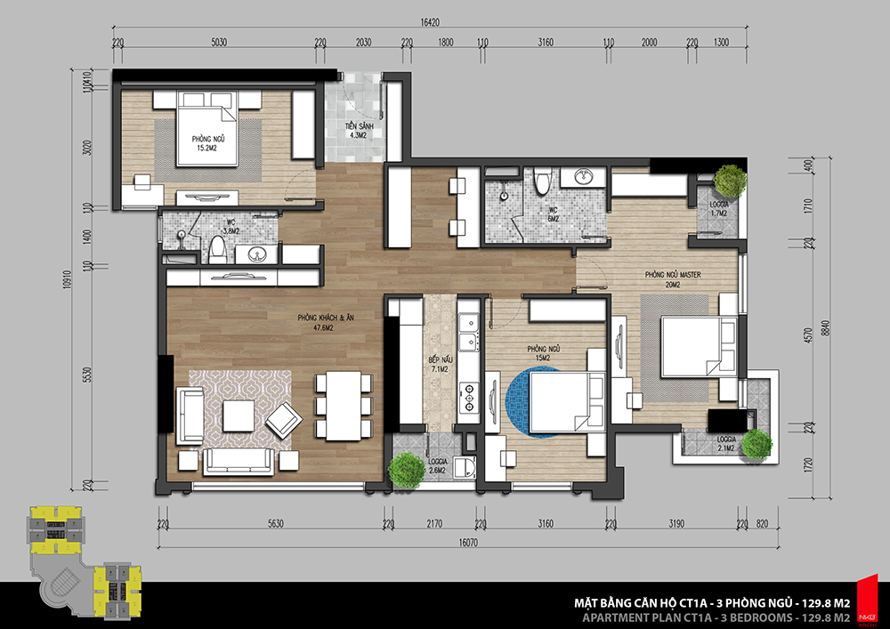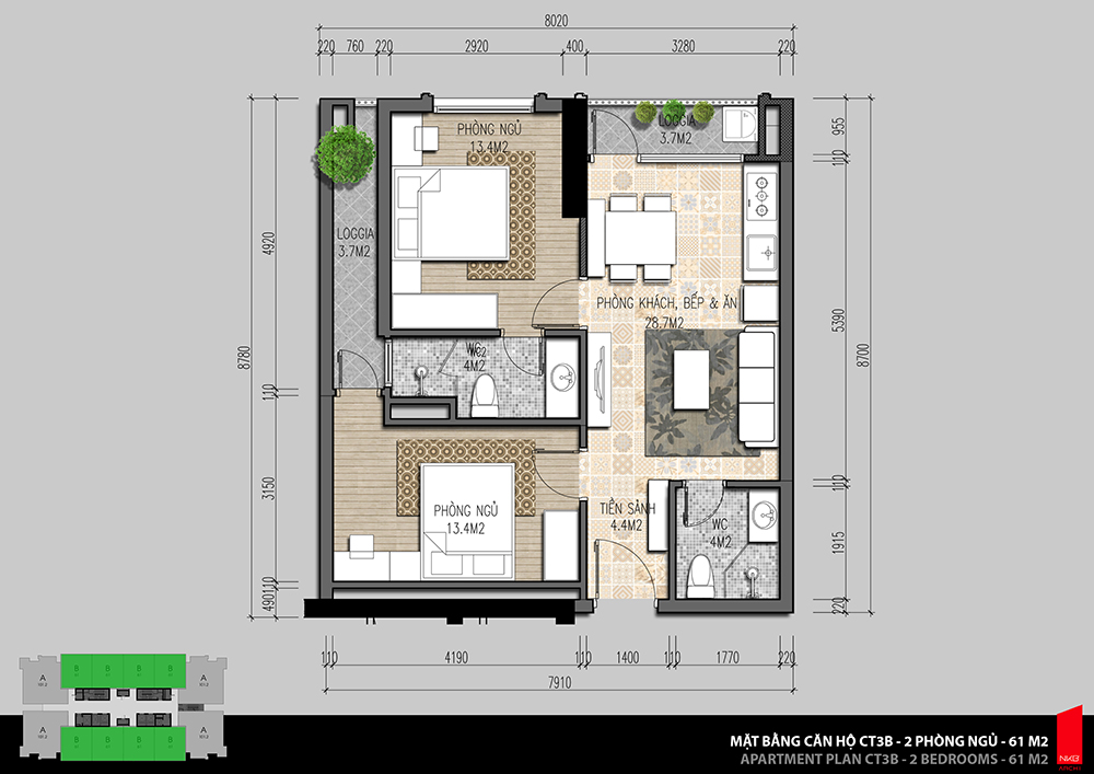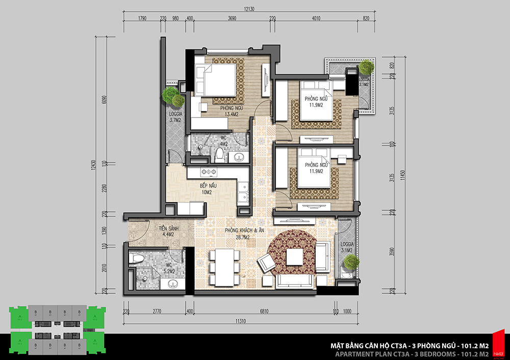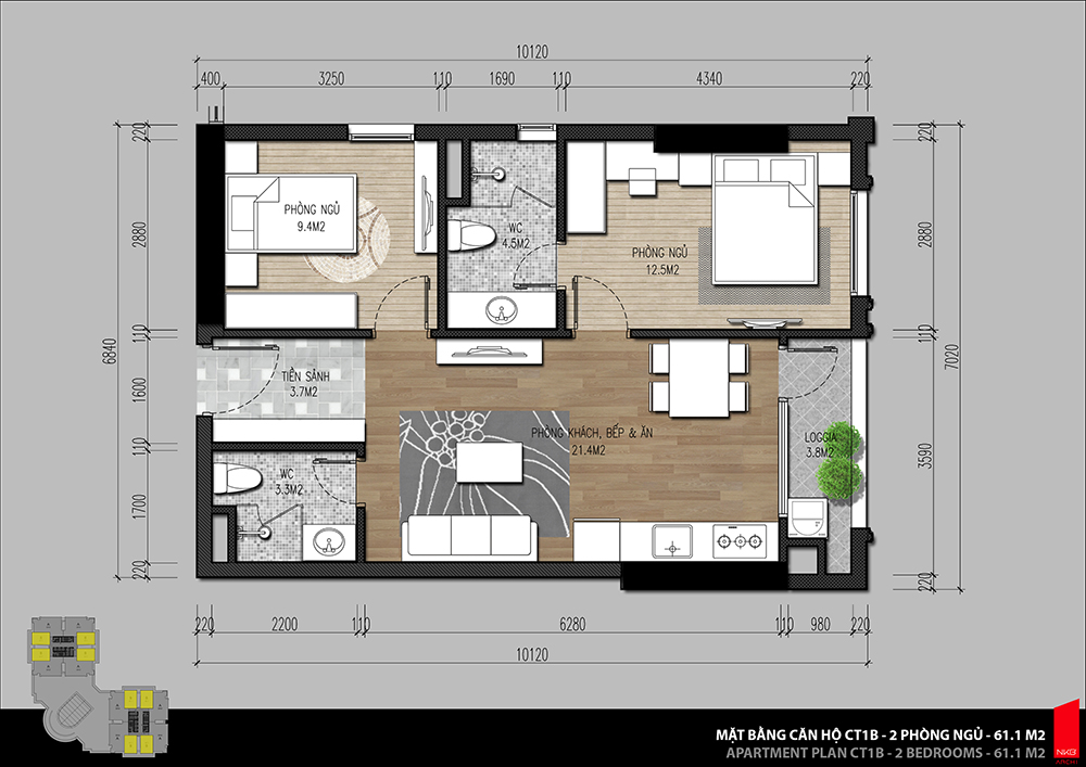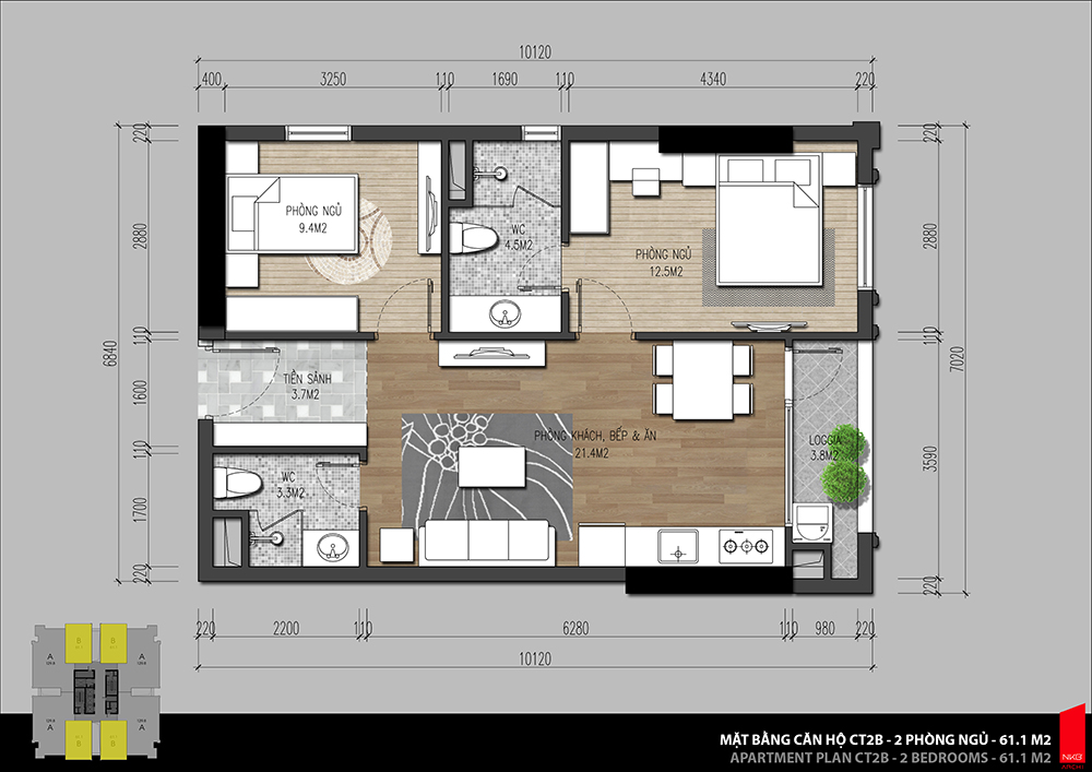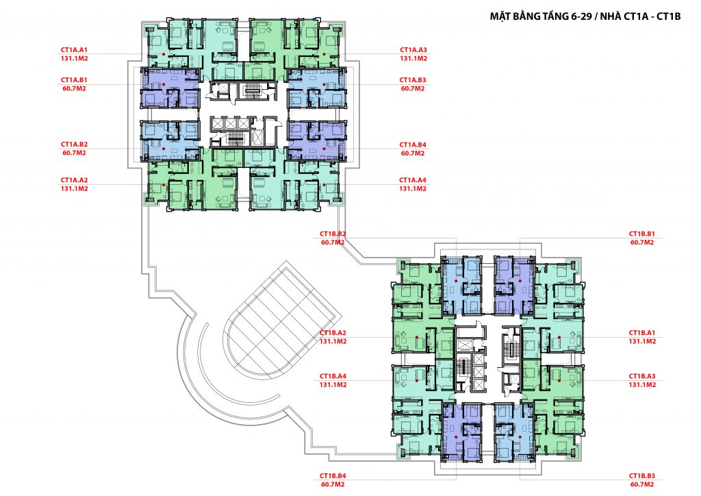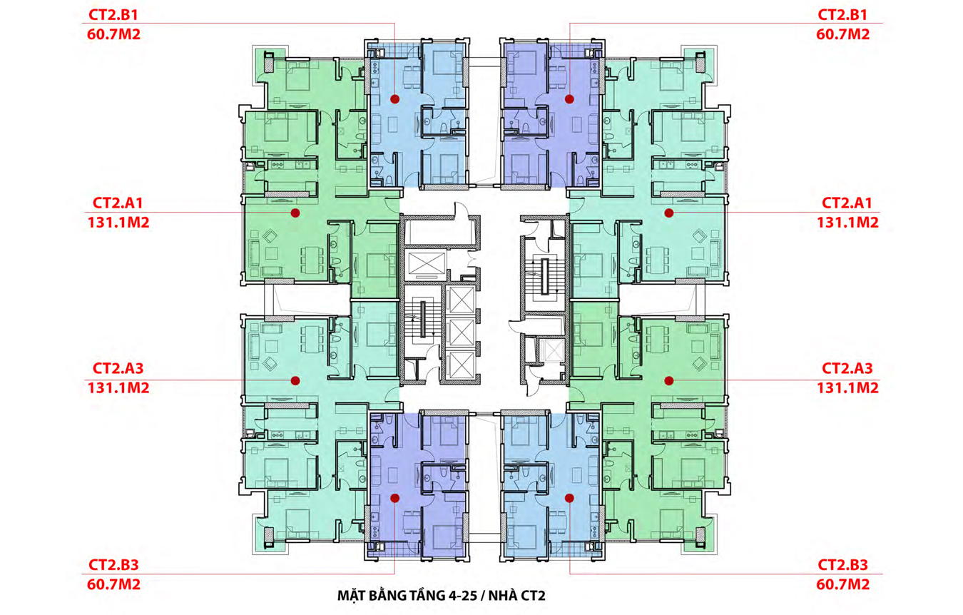 Diện tích căn hộ: 2 phòng ngủ: 60,4 – 61m2; 3 phòng ngủ: 99,4 – 130m2