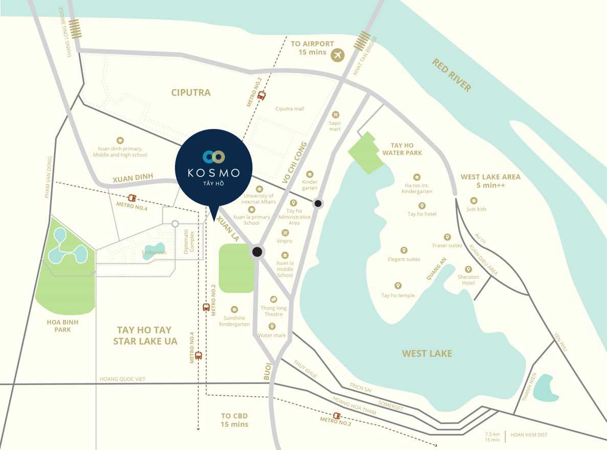 Chung Cư Kosmo Tây Hồ tọa lạc nằm ở phía Tây Hồ Tây, thuộc Phường Xuân Tảo, Quận Bắc Từ Liêm, Hà Nội – Một vị trí giao thông thuận lợi và là trục phát triển chính trị – kinh tế của Hà Nội. Từ vị trí khu căn hộ, cư dân có thể dễ dàng kết nối vào trung tâm thành phố và sân bay Nội bài thông qua các trục đường Phạm Văn Đồng – Cầu Nhật tân một cách nhanh chóng và thuận tiện.