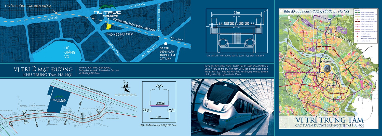 Theo quy hoạch của thành phố Hà Nội thì Tòa nhà sẽ nằm trên mặt đường chính rộng 22m, phía dưới là tuyến tàu điện ngầm của thành phố.cách ga tàu điện trên cao cát linh 200m. Các vị trí tiếp giáp Dự án Núi Trúc Square: