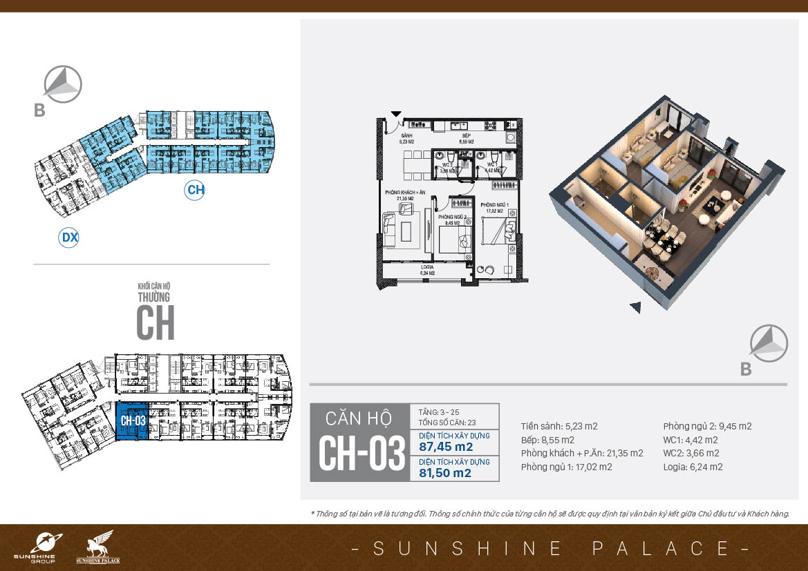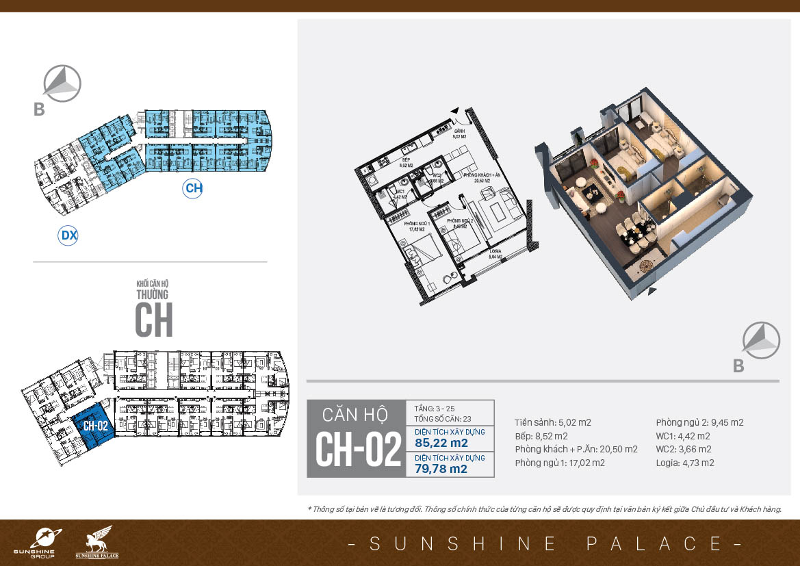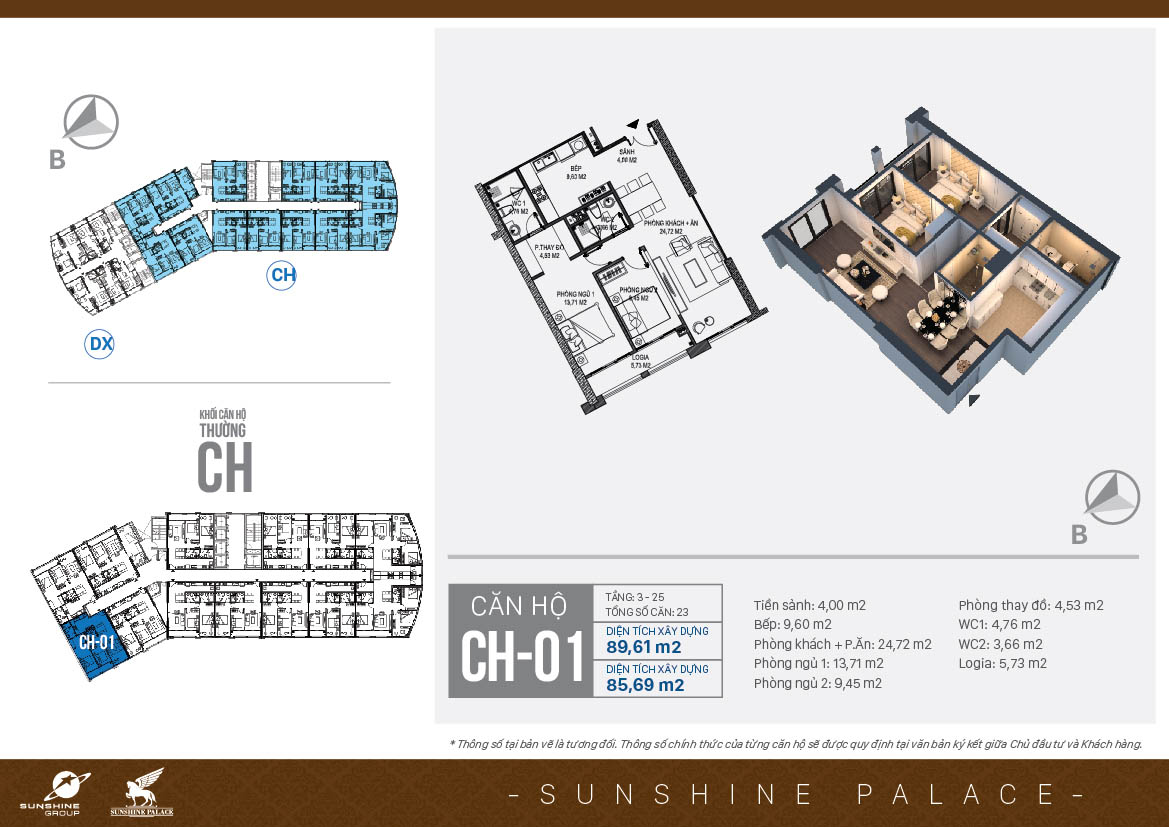 Các căn hộ của Sunshine Palace được thiết kế thông minh, mang tính hữu dụng cao với 3 loại hình căn hộ: Duplex, căn hộ thuần túy và căn hộ Penthouse, có diện tích linh hoạt từ 60m2 đến hơn 200m2, được thiết kế tối ưu công năng sử dụng, hoàn mỹ trong bố trí nội thất và hình thức kiến trúc. Tất cả các phòng chức năng trong căn hộ đều được tiếp xúc trực tiếp với Gió trời và Ánh sáng tự nhiên nhờ có hệ thống cửa sổ rộng rãi và khoảng mở lô gia lấy sáng lớn. Sự lưu thông không khí, yếu tố phong thủy quan trọng bậc nhất của một không gian sinh tồn đã được cân nhắc và tính toán tỉ mỉ, nhằm đem đến cho khách hàng một trải nghiệm sống trong lành và tràn đầy sinh khí.