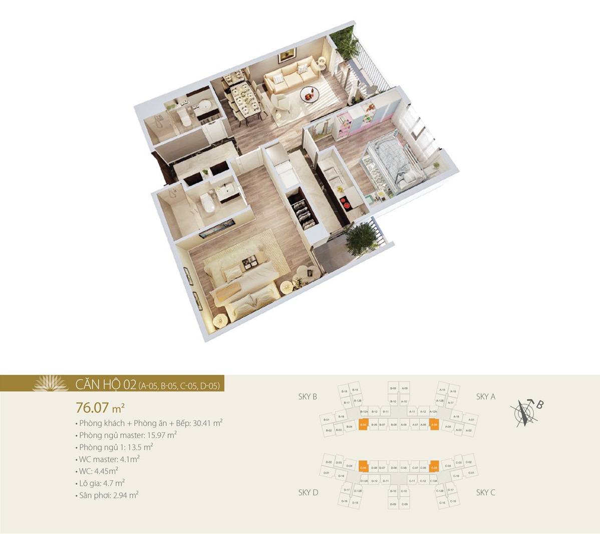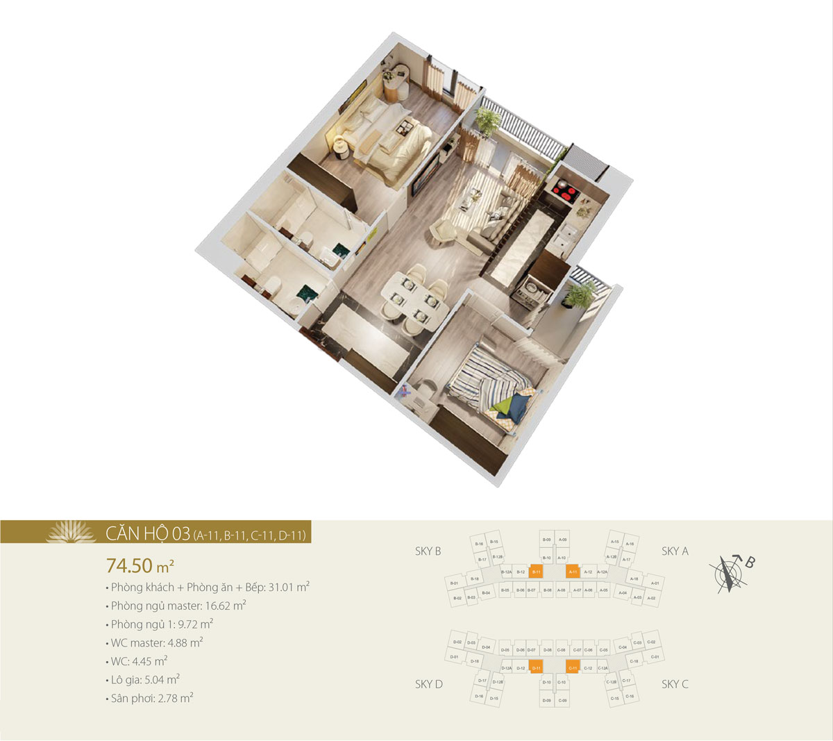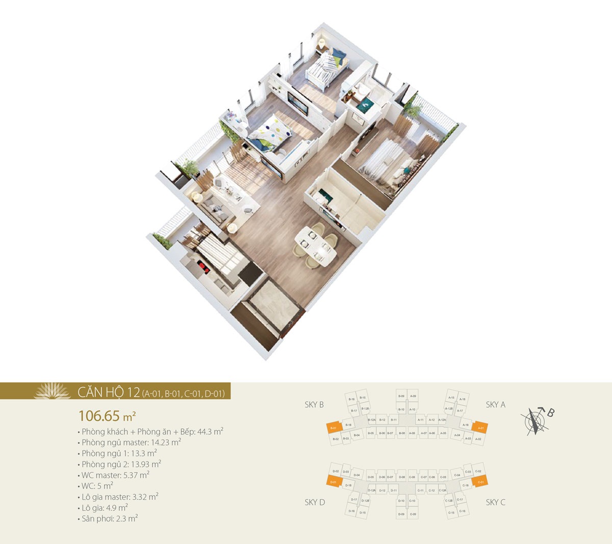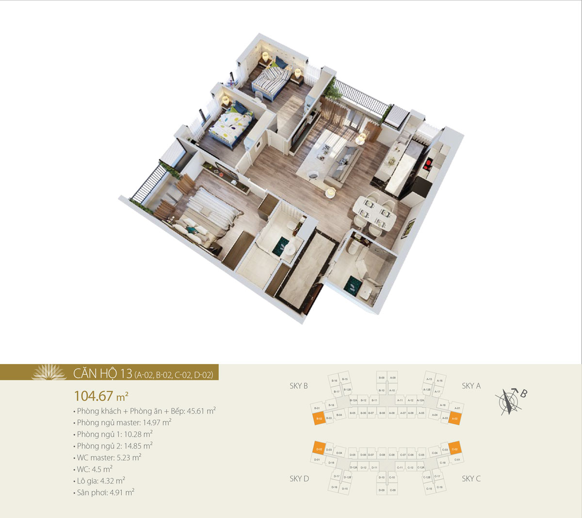 Diện tích thông thủy căn hộ: Từ 57,91m2 đến 105,21m2
