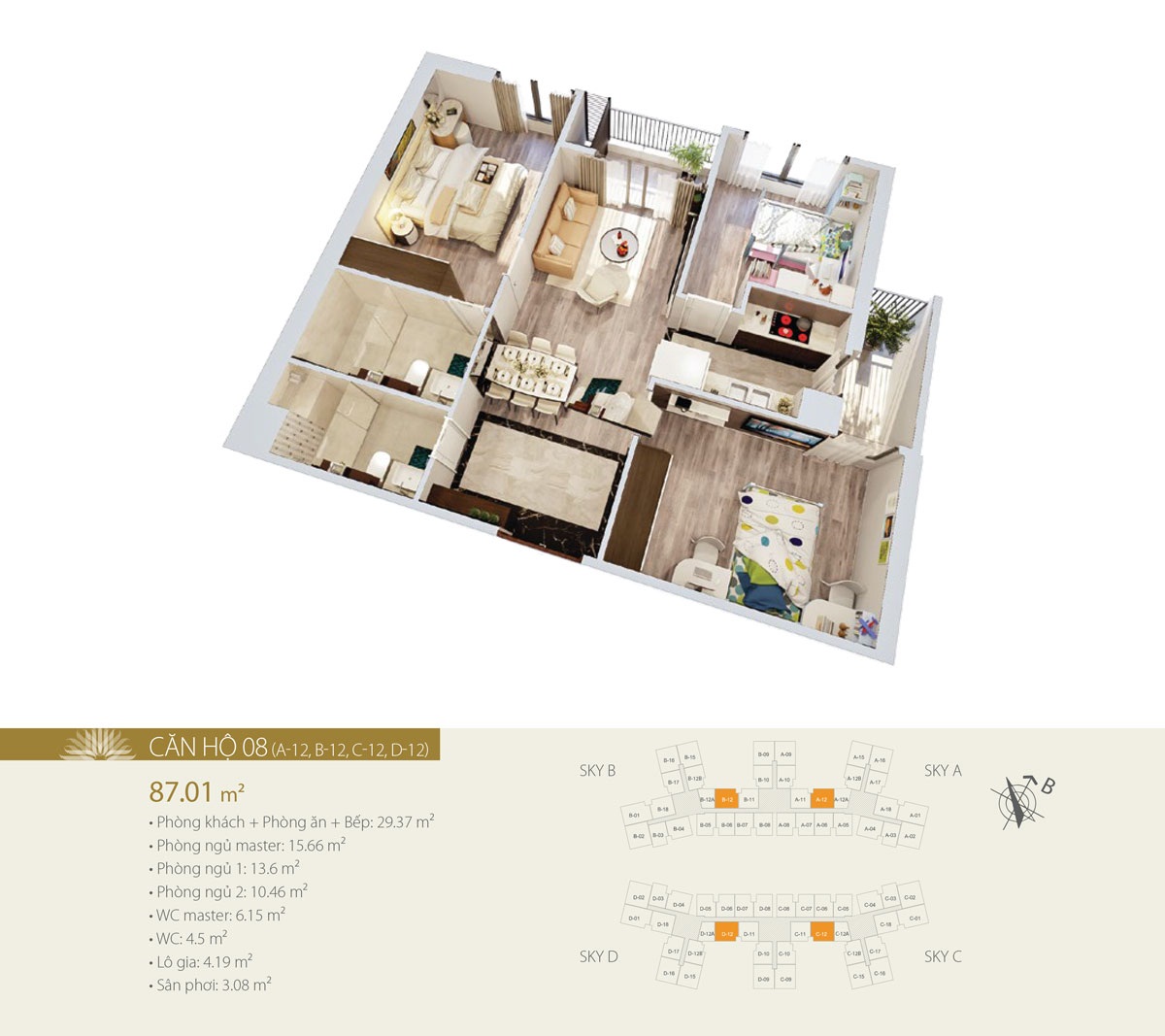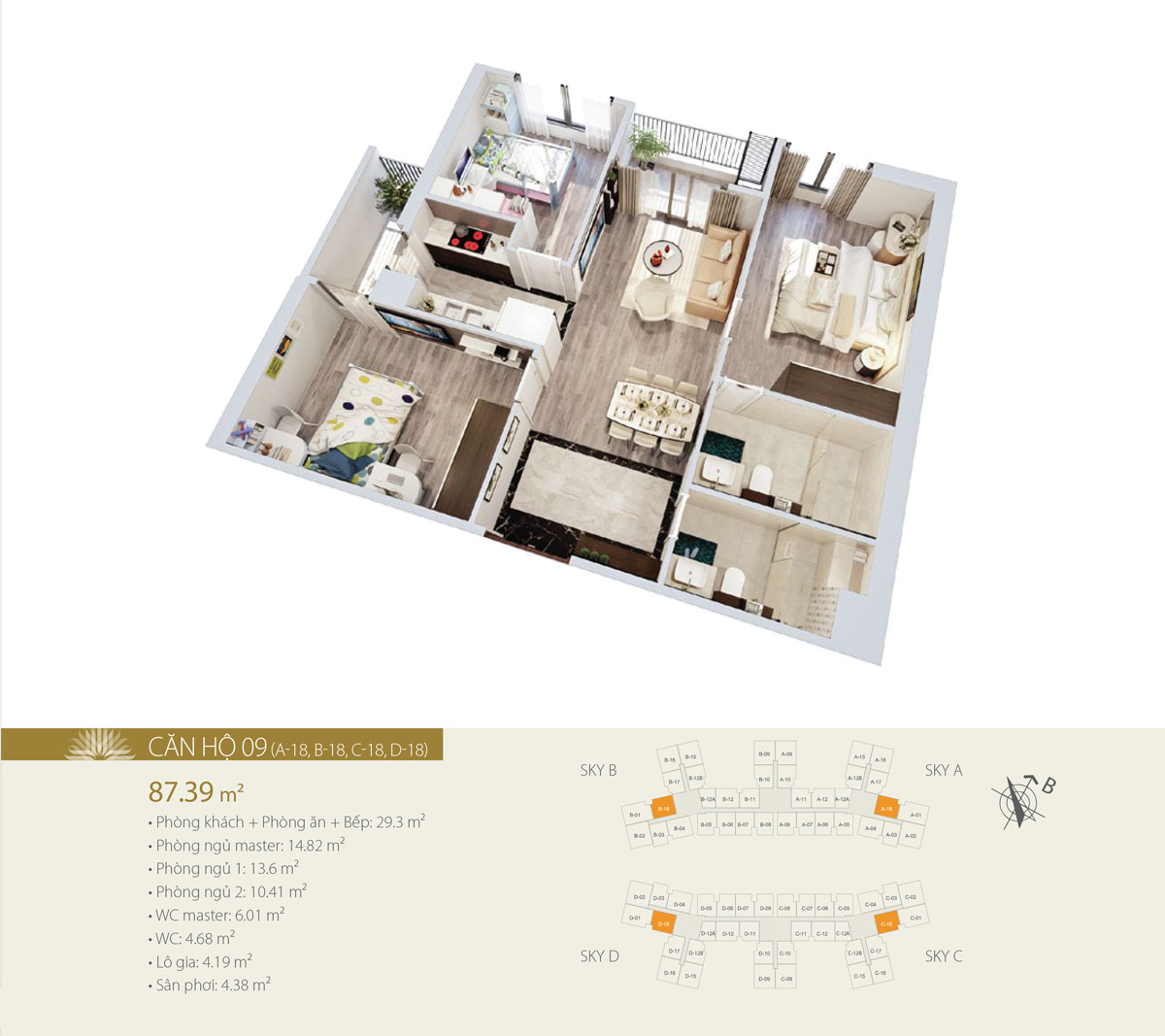 Mỗi tầng gồm 18 căn hộ (10 căn 2 phòng ngủ và 8 căn 3 phòng ngủ), có diện tích từ 57.91 – 105.21m2. Số lượng căn góc có 2 mặt thoáng nhiều, tầm nhìn bao quát sông Hồng và trung tâm thành phố.