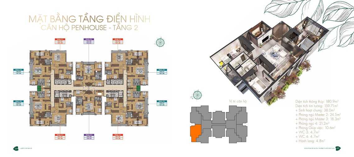 Đa dạng về diện tích đó là một trong những ưu điểm của Green Diamond Láng Hạ khi bao gồm 314 căn hộ với diện tích từ đa dạng từ 46-70-75-85-89-92-110-136-140-150-156-162-177-180m2 (từ 1-4 phòng ngủ) và 10 căn hộ penthouse (từ 341m2 đến 352m2). Bên cạnh đó, với các logia cây xanh trong mỗi căn hộ mang đến một không gian sống thân thiện, hài hòa với thiên nhiên.