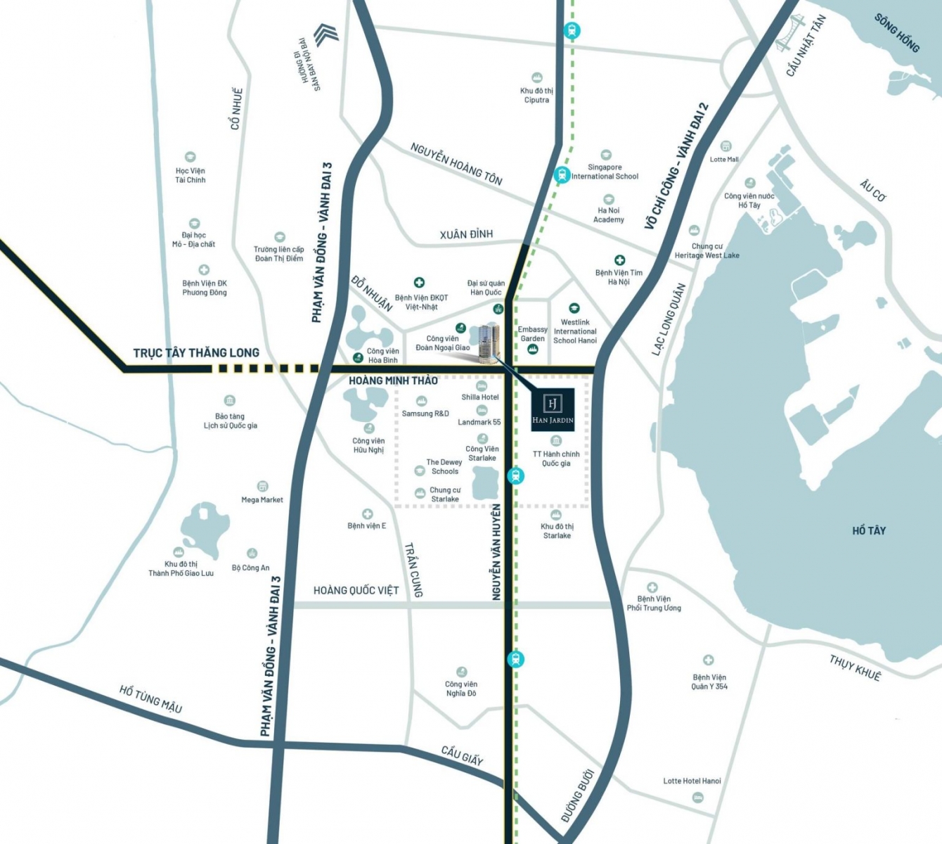 Từ Han Jardin Ngoại Giao Đoàn cư dân cũng có thể dễ dàng kết nối với sân bay Nội Bài và các khu đô thị hiện đại đã hiện hữu trong khu vực như KĐT Ciputra, Star Lake,… hay hệ thống tiện ích công cộng đồng bộ, hiện đại trong khu vực như Công viên Hòa Bình, Siêu thị Mega market, trường ĐH Điện Lực, HV kỹ thuật Quân Sự, Cao đẳng Du lịch, trường phổ thông quốc tế Newton,…